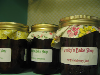 My recent adventure was strawberry preserves and rastrablaberry jam. Dad and I washed and stemmed the fruit, hovered over the pot as Preston and I stirred and skimmed the foam (cackling like MacBeth's hags just for kicks), boiled the jars and ladled our finished product into their new homes before re-boiling the filled jars to double-sanitize. I cut fabric for the tops and printed labels and voila! We are now selling them in the shop!